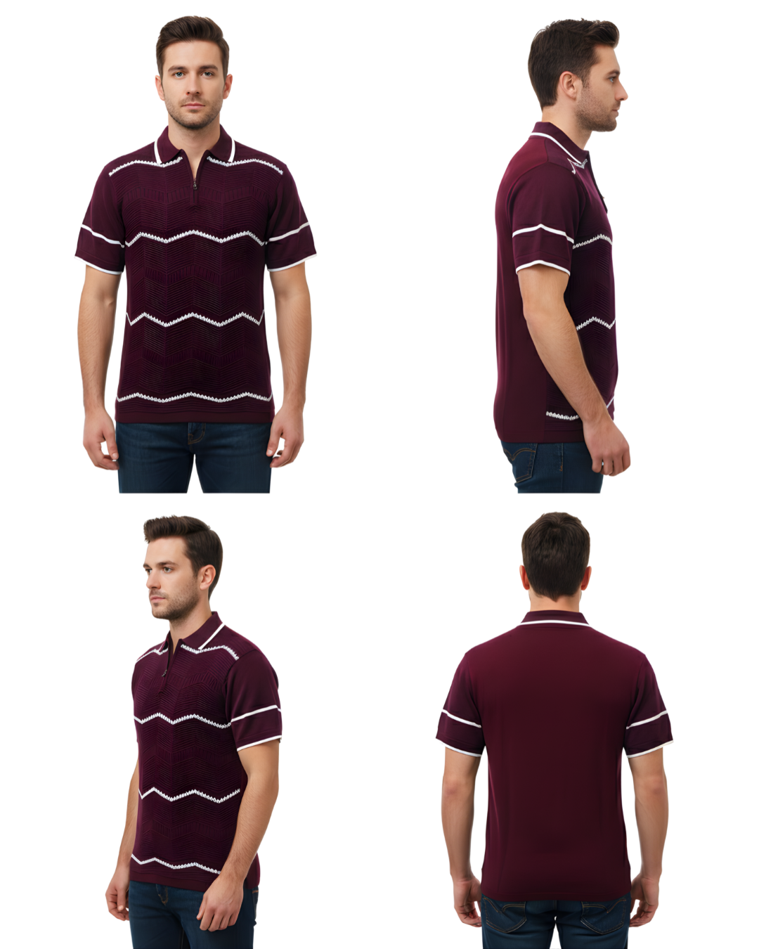 Keywords: maroon knit polo, textured t-shirt men, chevron pattern polo, half sleeve zip t-shirt, summer casual wear.
